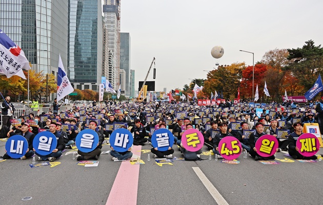 특히 이날은 금융노조 한명호 수출입은행지부 수석부위원장이 현장 발언자로 나서 눈길을 끌었다. 한명호 수석부위원장은 “주4.5일제는 단순한 근로시간 단축이 아니라 일하는 방식과 삶의 질을 바꾸기 위한 투쟁”이라며 “이는 내일을 살아갈 우리 아이들을 위한 길”이라고 말했다. 이어 “우리의 투쟁은 결과뿐 아니라 그 과정 자체가 의미 있는 여정이며, 동지들과 함께라면 어떤 어려움도 이겨낼 수 있다”고 덧붙였다.